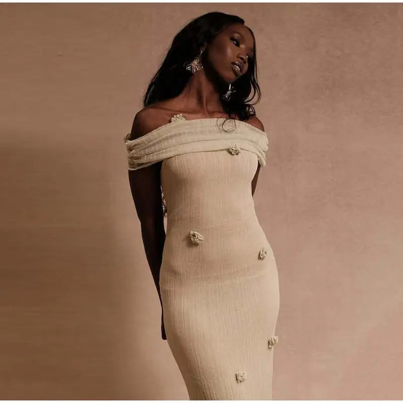 The 3D Floral Off-Shoulder Maxi Dress – Sheath Silhouette in Ivory blends minimal elegance with delicate artistry. Its off-shoulder slash neckline creates a graceful frame, while slim tailoring elongates the figure in a floor-length sheath design. Light three-dimensional floral accents scatter across the dress, offering subtle dimension and softness.