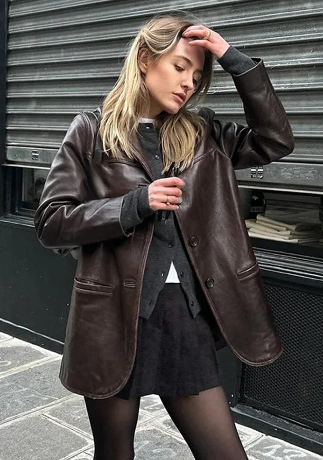 Timeless brown leather blazer with loose fit and refined design. Perfect for autumn/winter layering, office style, and versatile fashion that boosts confidence and elegance.