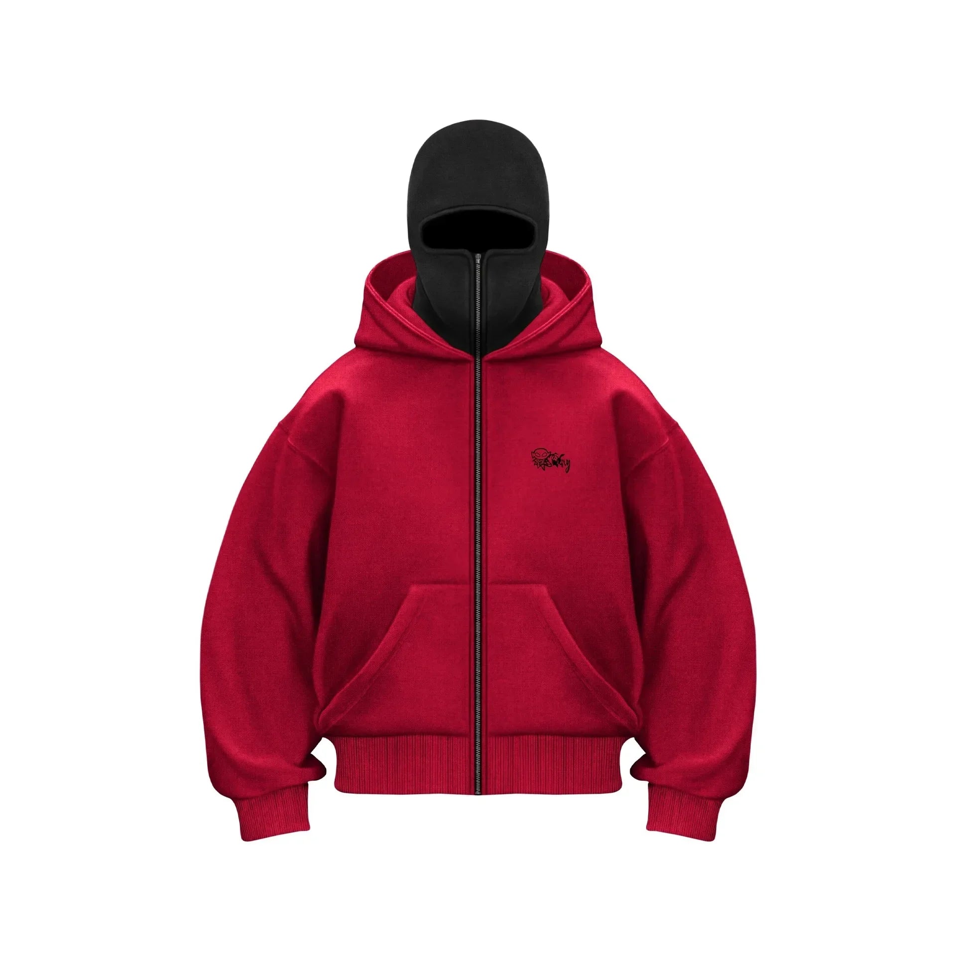 Trendy Y2K zip-up hoodie with bold gothic print, double hood, and oversized fit — perfect for hip hop and streetwear style.